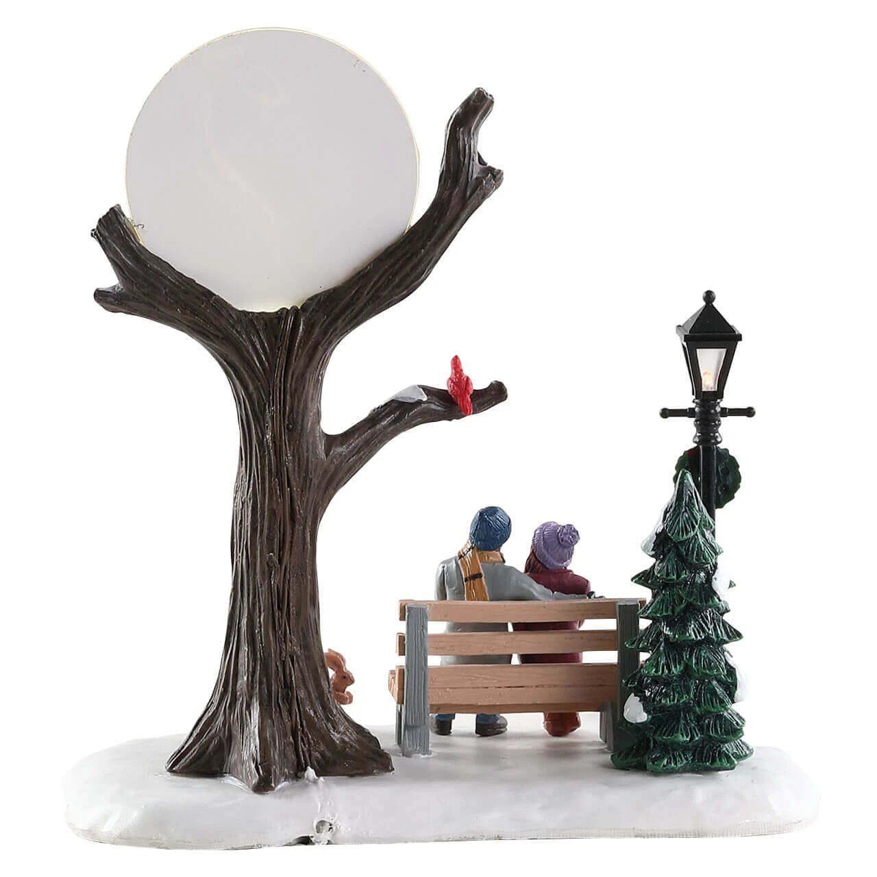 Lemax Christmas Moon – 84359 appartiene alla collezione Lemax 2018 e fa parte del tema Lemax Vail Village. Una coppia si riscalda accoccolata su una panchina alla luce della luna. Attorno, la neve, una coppia di coniglietti e un curioso scoiattolo completano la scena.