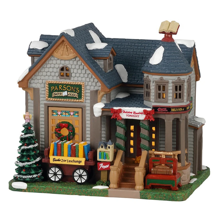 Parson’s Bindery & Books appartiene alla collezione Lemax 2021 e fa parte del tema Lemax Caddington Village. Bindery and Books di Parson è progettato per gli amanti della lettura. Questa sera questo edificio in stile vittoriano ospita un evento di lettura durante le vacanze! I cartelli pubblicizzano migliaia di libri all’interno, mentre un carro si trova all’esterno, pubblicizzando uno scambio di libri 2 per 1. C’è anche un albero di Natale decorato con un angelo in punta e una mini biblioteca con libri gratuiti. Sul lato destro dell’edificio c’è persino una rilegatrice tradizionale. In cima al tetto c’è un libro aperto, che ti invita a entrare e leggere!