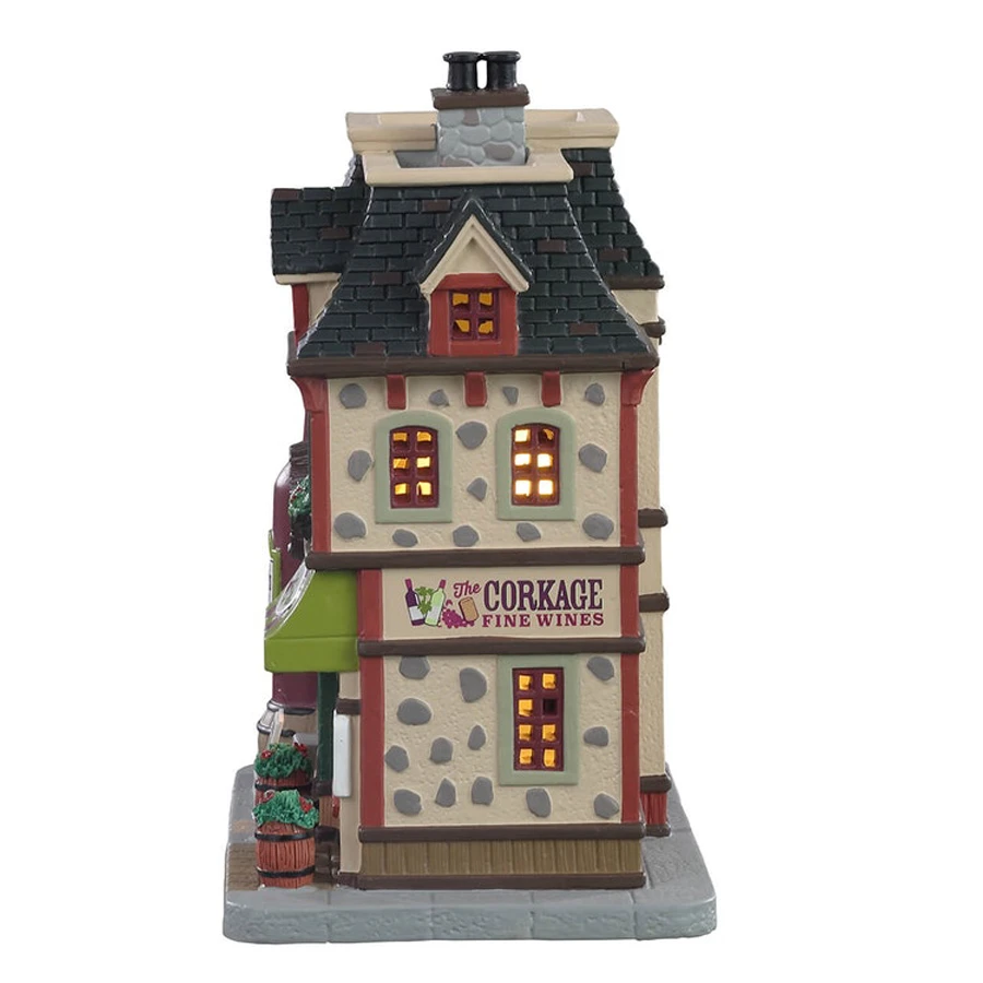 The Corkage appartiene alla collezione Lemax 2021 e fa parte del tema Lemax Caddington Village. Il Corkage è il paradiso degli amanti del vino. Questo simpatico edificio è difficile da non notare, perché c’è un’enorme bottiglia di vino appoggiata a una botte accanto all’edificio. Una vetrina illuminata si trova accanto all’ingresso dell’edificio, mostrando una varietà di vini. Sulla destra dell’edificio c’è un bar dove gli ospiti possono sedersi per una degustazione di vini. Al piano di sopra, la luce splende dalle finestre dell’appartamento.
