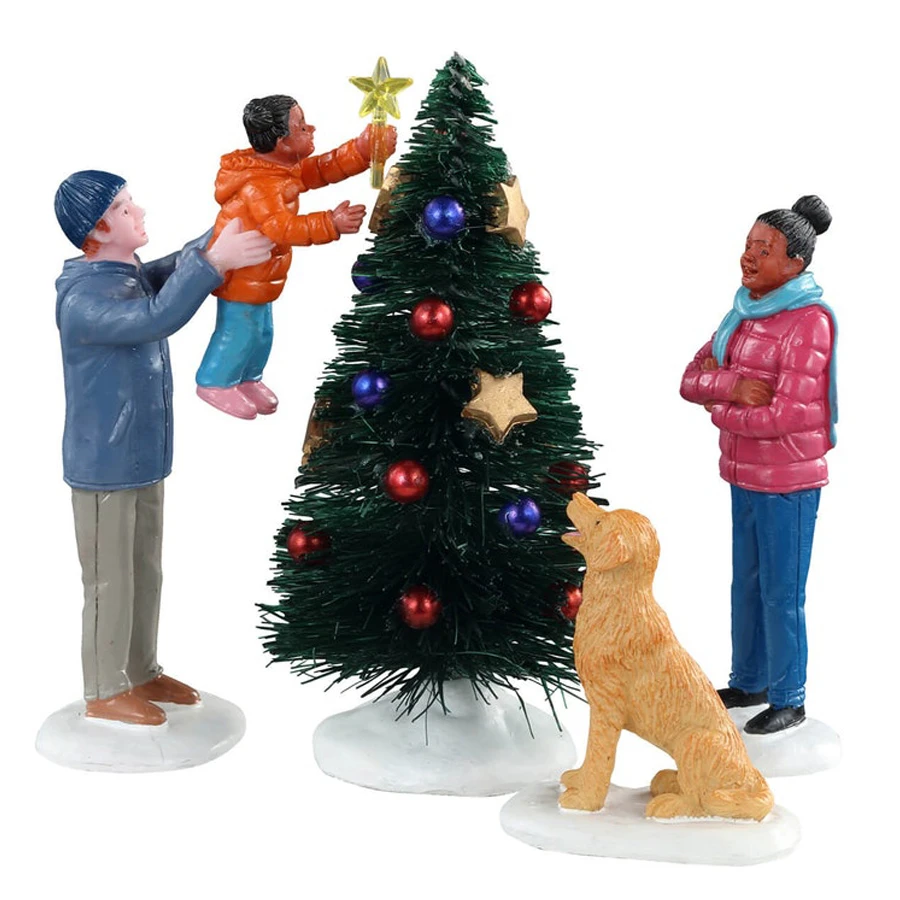The Final Touch, Set di 4 appartiene alla collezione Lemax 2021 e fa parte del tema Lemax General. Un albero di Natale non è completo senza il tocco finale. Questa adorabile famiglia è entusiasta che le vacanze siano arrivate e finalmente possono decorare l’albero. Mamma e cane stanno guardando amorevolmente mentre papà solleva la figlia in modo che possa mettere il puntale in cima all’albero. Ora è finalmente completo!